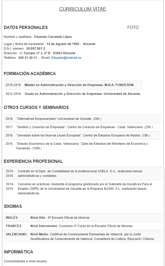 Los profesionales dedicados a la contratación de personal esperan que el Curriculum Vitae sea la expresión clara y concisa de informaciones sobre datos personales, formación y experiencia profesional de la persona que aspira a un empleo.