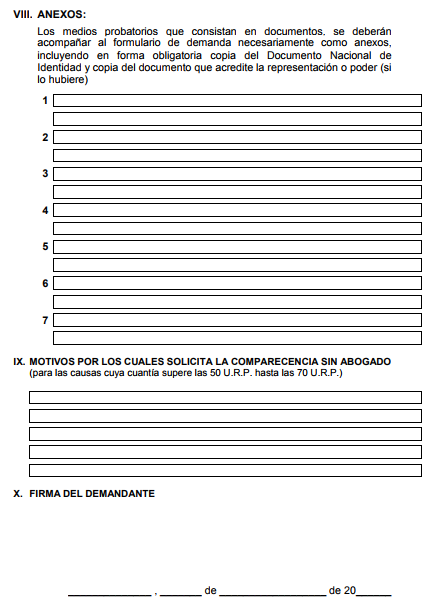 - Datos de la persona quien hace la demanda, el el segundo espacio su numero de DNI, en el tercer espacio su dirección de casa real donde lo puedan ubicar y por ultimo el domicilio legal en ese espacio se puede colocar la dirección del representante que puede ser el abogado.