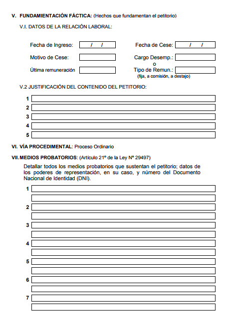 5. Dundamentación Fáctica: En este espacio se llenara con los hecho de fundamentan el petitorio de la demanda, en el cual debe señalar las fechas, motivo de cese, cargo desempeñado, última remuneración y tipo de remuneración. Lego en los 5 espacios que tienes debes de dar una justificación del contenido petitorio.